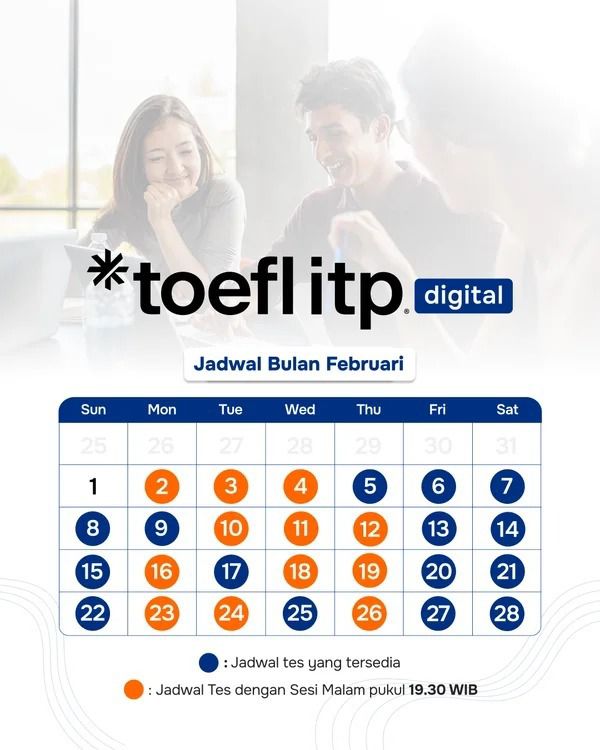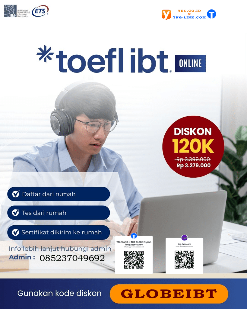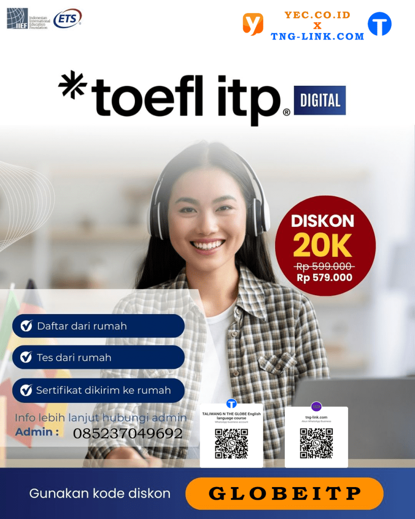 Tes resmi ETS untuk kebutuhan studi/beasiswa internasional. Daftar & tes online, hasil sesuai kebijakan ETS. Info umum ketersediaan global & penjadwalan ada di situs ETS. YEC Shop+2ETS+2 - TOEFL ITP Digital (Official – ETS/IIEF, via YEC)